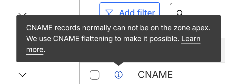日本語にすると「ゾーンapexには通常CNAMEは使えないので、CNAME Flatteningを使います」という旨のメッセージ